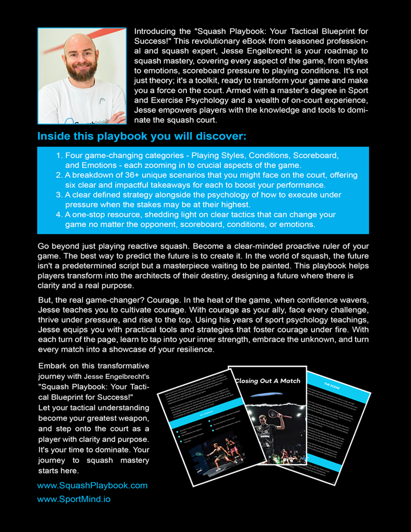 Unlock the secrets of squash with Jesse Engelbrecht's "Squash Playbook: Your Tactical Blueprint for Success!" Dive deep into game-changing categories like Playing Styles, Conditions, Scoreboard, and Emotions. This isn't just a book; it's a comprehensive toolkit crafted by a seasoned professional, blending strategy with psychology.